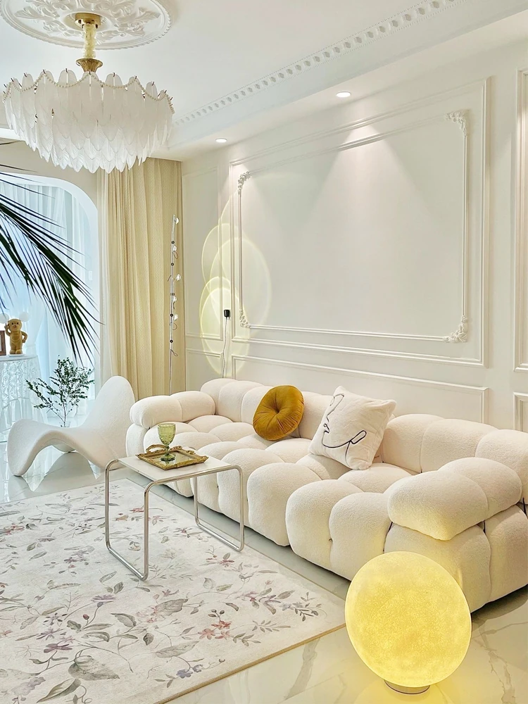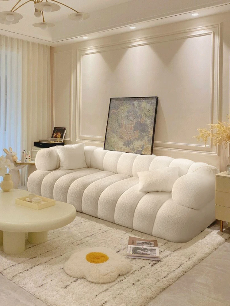 Trendy Plush Lambswool Sofa for Small Living Rooms – Stylish 3-Seater in Nordic Cotton Candy French Cream Design