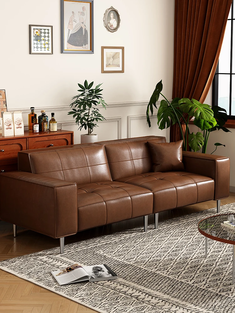 Vintage Tofu Block Leather Sofa for Small Living Rooms - Retro Italian Minimalist 3-Seater with Oil-Waxed Finish | Perfect for Stylish and Cozy Spaces