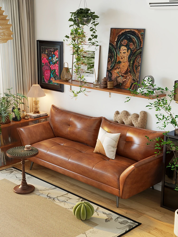 Italian Vintage Waxed Leather Sofa for Small Apartments - Modern Retro Upholstered Loveseat for Living Room, Double 3-Seater, Chic and Affordable Luxury Design